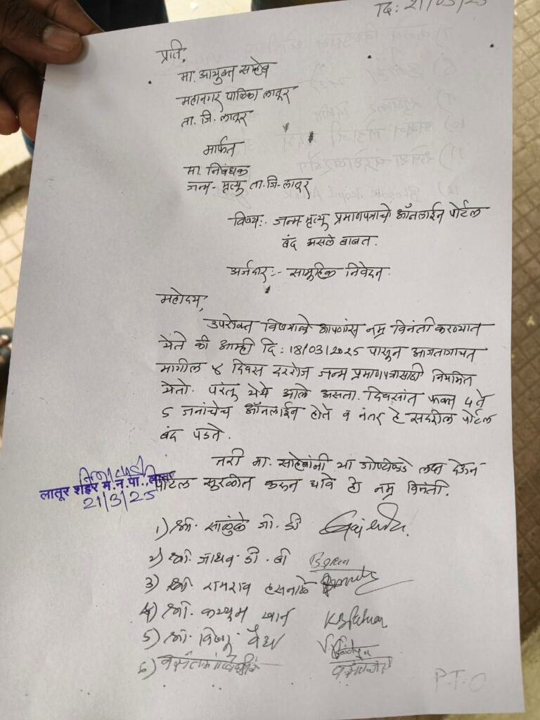 लातूर शहर झपाट्याने वाढत आहे. नागरी सुविधांची मागणीही त्याच वेगाने वाढते आहे. जन्म आणि मृत्यू नोंदणी हा प्रत्येक नागरिकाचा मूलभूत हक्क असून, तो वेळेत पूर्ण होणे आवश्यक आहे. परंतु लातूर महापालिकेच्या ऑनलाइन पोर्टलवर दिवसाला केवळ तीन ते चार अर्ज स्वीकारले जात असल्याने हजारो नागरिकांची प्रचंड गैरसोय होत आहे.