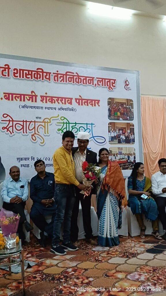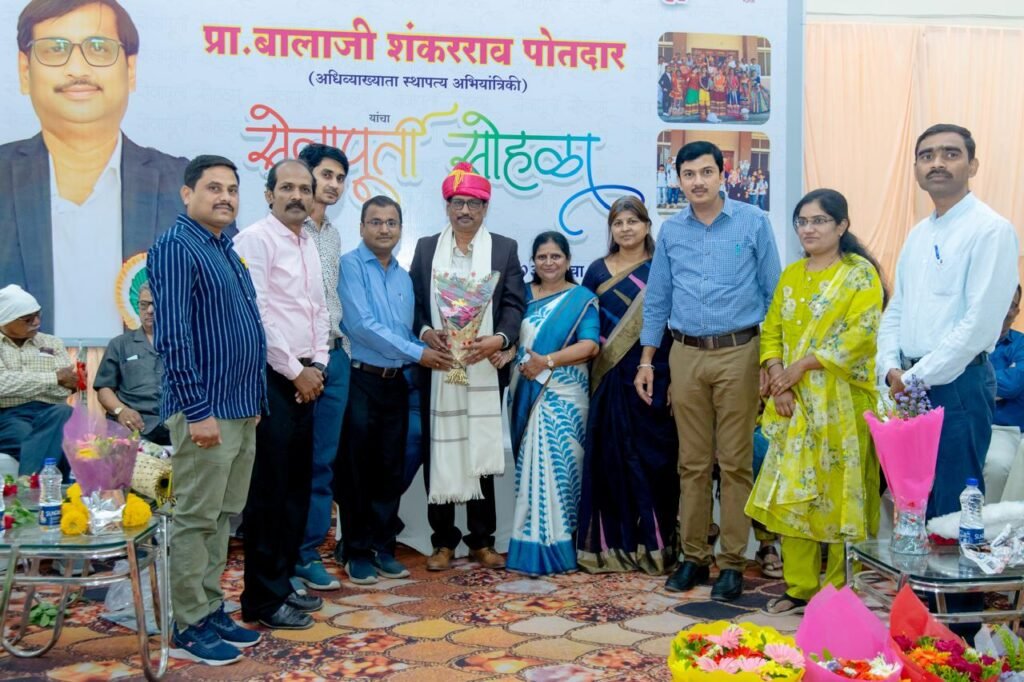 लातूर – पुरणमल लाहोटी शासकीय तंत्रनिकेतन, लातूरच्या स्थापत्य अभियांत्रिकी विभागप्रमुख प्रा. बालाजी शंकरराव पोतदार यांच्या सेवानिवृत्ती निमित्त संस्थेच्या वतीने दि. 28 मार्च 2025 रोजी भावनिक आणि उत्साहपूर्ण निरोप समारंभाचे आयोजन करण्यात आले. 35 वर्षे 6 महिने या प्रदीर्घ सेवाकालात हजारो अभियंत्यांना घडवणाऱ्या पोतदार सरांचा सन्मान करताना संपूर्ण तंत्रनिकेतन कृतज्ञतेने भरून गेले.