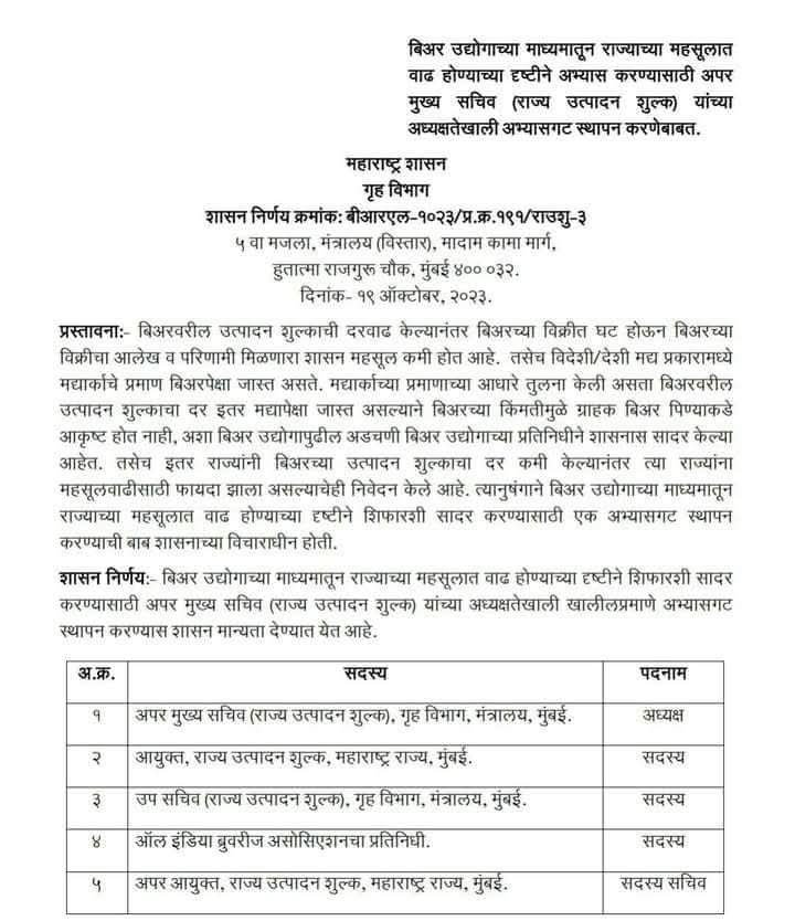 - बियर प्रेम वाढवण्यासाठी तातडीची समिती: राज्य शासनाने ‘बियर विकास व संख्याशास्त्र’ अभ्यास गट तातडीने स्थापन केला, ज्याचा उद्देश “बियरप्रेमी वाढवणे आणि अर्थव्यवस्थेला चालना देणे”!