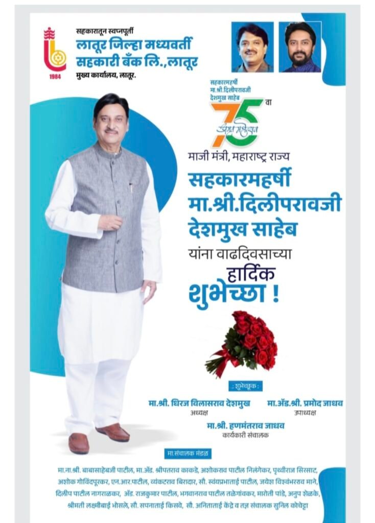 सामाजिक भान, राजकीय दूरदृष्टी आणि लोककल्याणाचा ध्यास यांचे उत्तम मिश्रण असलेले व्यक्तिमत्त्व म्हणजे मा. दिलीपराव दगडोजीराव देशमुख. आज त्यांच्या जीवनातील एक अत्यंत महत्त्वाचा टप्पा – अमृतमहोत्सवी वाढदिवस – आपण साजरा करत आहोत, ही समस्त लातूर जिल्ह्यासह महाराष्ट्रासाठी अभिमानाची बाब आहे.