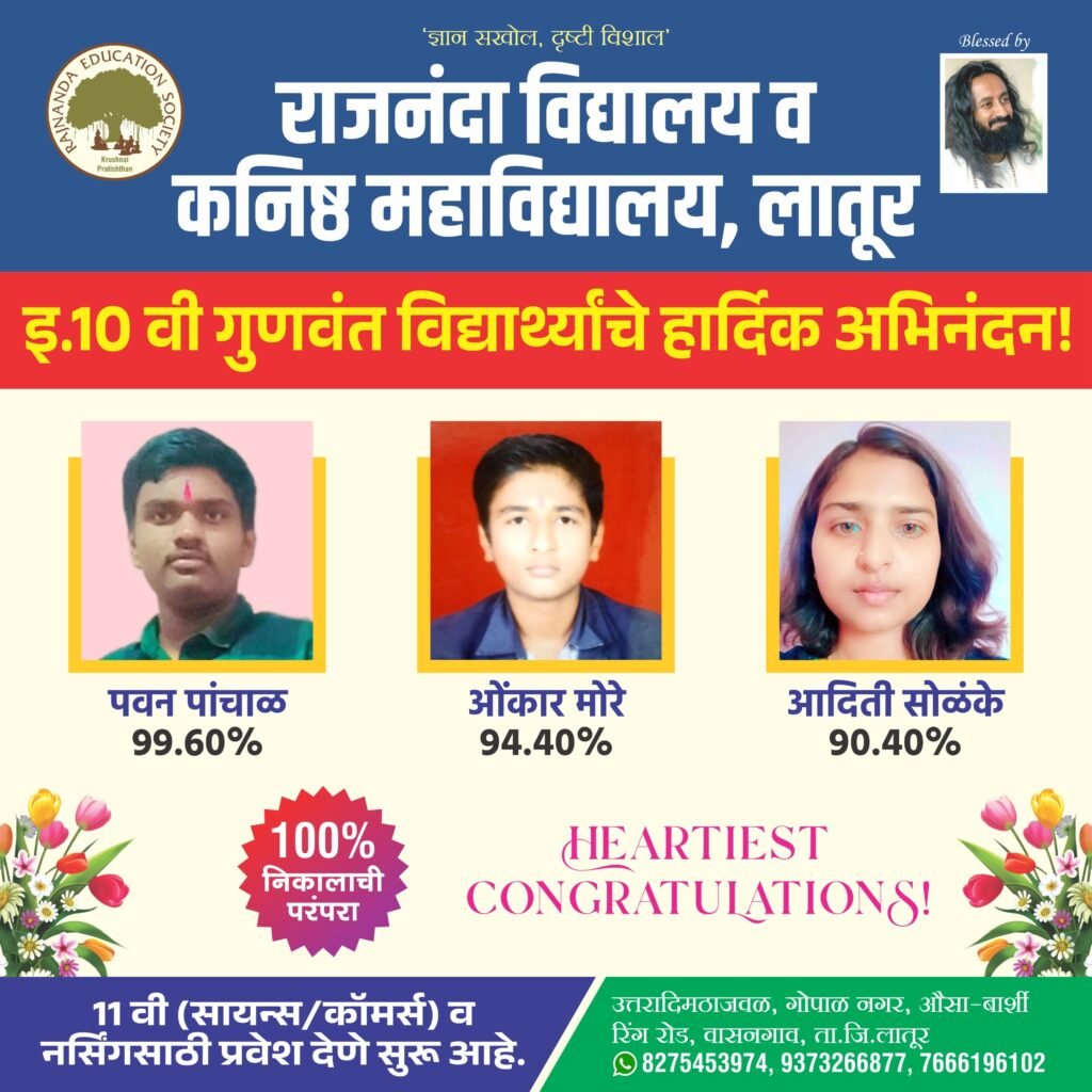 या परीक्षेत पवन पांचाळ याने तब्बल ९९.६०% गुण मिळवून शाळेत प्रथम क्रमांक, तर ओंकार मोरे याने ९४.४०% गुणांसह द्वितीय क्रमांक, आणि आदिती सोळंखे हिने ९०.४०% गुण मिळवून तृतीय क्रमांक पटकावला आहे. या यशस्वी विद्यार्थ्यांचे संपूर्ण लातूर परिसरातून कौतुक होत आहे.