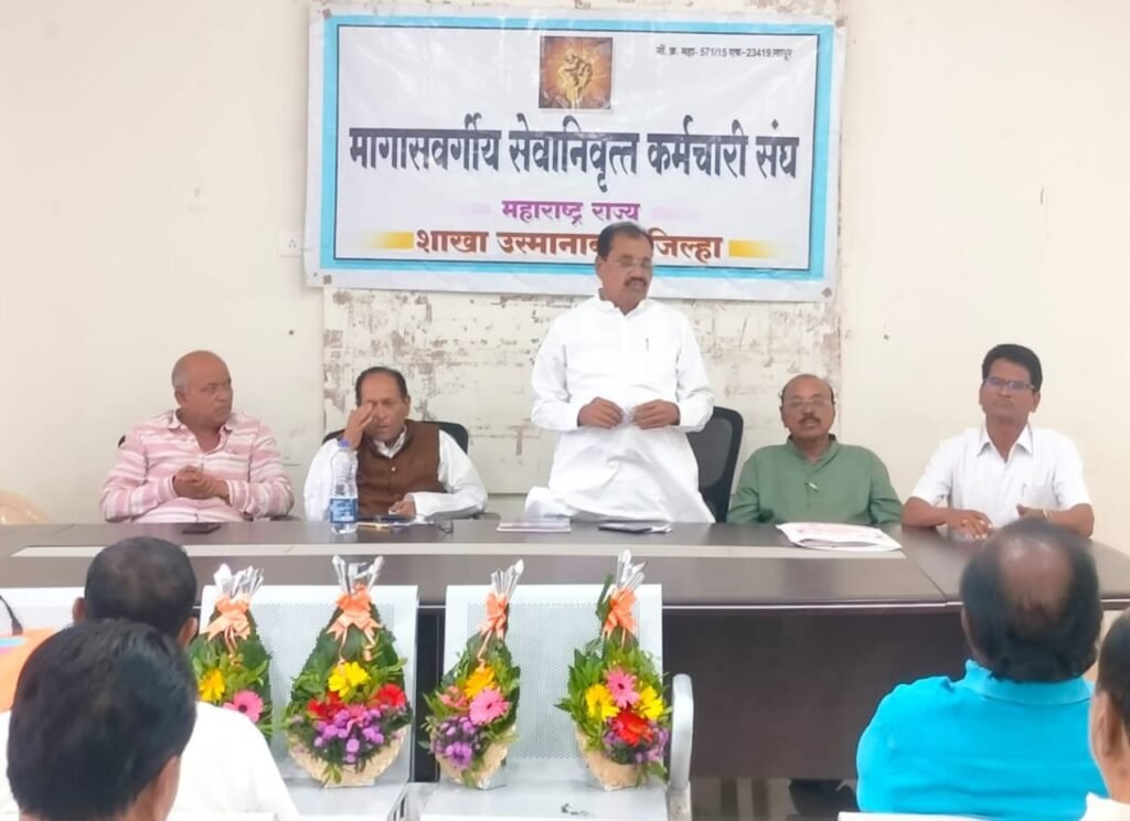 मागासवर्गीय सेवानिवृत्त कर्मचारी संघाची बैठक दि. 11/07/025 रोजी शासकीय विश्रामगृह, धाराशिव येथे संपन्न झाली. या बैठकीच्या अध्यक्ष स्थानी संघटनेचे मराठवाडा अध्यक्ष बलभीमराव कोथींबीरे हे होते. बैठकीस संघटनेचे अध्यक्ष प्रा. अनंत लांडगे, राज्य उपाध्यक्ष विनायक बोरीकर, राज्य संघटक रमेश श्रृंगारे यांनी मार्गदर्शन केले यावेळी बोलताना प्रा. अनंत लांडगे म्हणाले की, मागासवर्गीय सेवानिवृत्त कर्मचाऱ्यांनी सामाजिक बांधिलकी जपून समाज कार्यात झोकून देवून कार्य केले पाहिजे. कर्मचाऱ्यांच्या अडी-अडचणी सोडविल्या पाहिजे. त्यासाठी सामुहिक प्रयत्न करणे गरजेचे आहेत. पूरोगामी चळवळी जिवंत राहण्यासाठी कर्मचाऱ्यांनी संघटनेत कार्य करायला हवे. सुरुवातीस कार्यक्रमाचे अध्यक्ष व प्रमुख पाहूणे यांचे पुष्पगुच्छ देवून स्वागत करण्यात आले याच बैठकीत जिल्हा कार्यकारणीची निवड करण्यात आली.