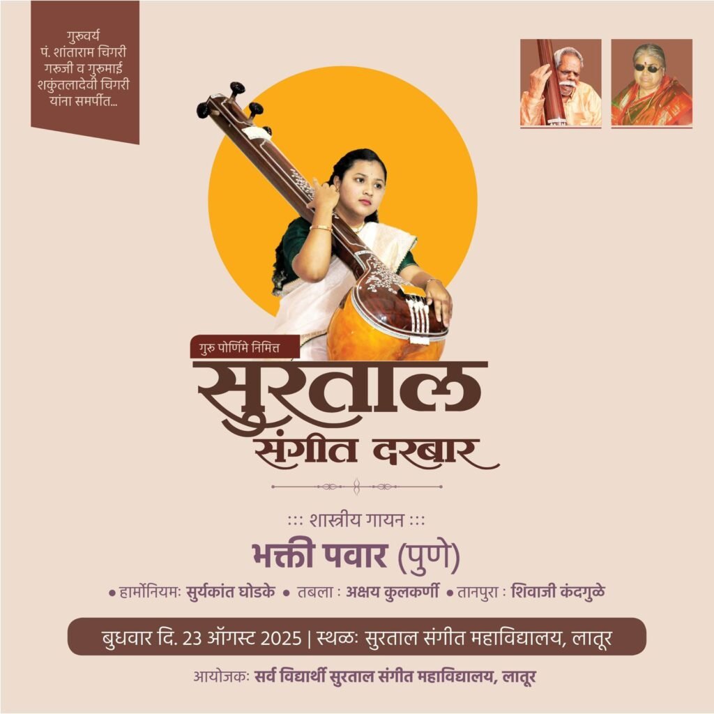 लातूर : भारतीय शास्त्रीय संगीतातील महान गुरु पं. शांताराम चिगरी गुरुजी व आदरणीय स्व.शकुंतलादेवी चिगरी यांच्या स्मरणार्थ गुरुपौर्णिमेनिमित्त सुरताल शास्त्रीय संगीत सभेचे आयोजन करण्यात आले आहे. दिनांक 23 जुलै,वार बुधवार रोजी सायंकाळी 6.00 वाजता नवीन रेणापूर नाका येथील सुरताल संगीत महाविद्यालय येथे युवा गायिका भक्ती पवार,पुणे यांचे शास्त्रीय गायन होणार आहे.