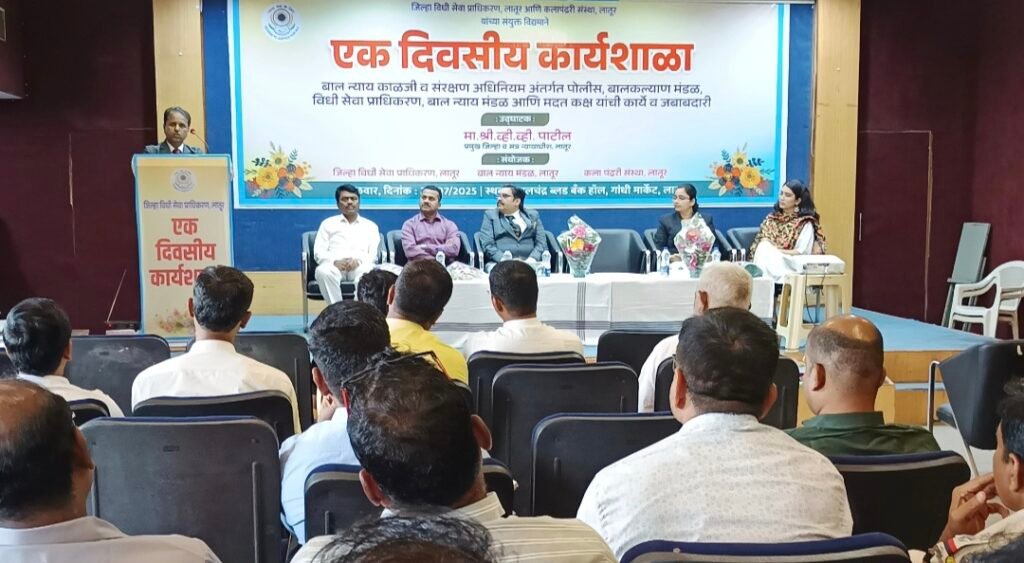 लातूर- जिल्हा विधी सेवा प्राधिकरण लातूर ,बाल न्याय मंडळ,आणि कलापंढरी संस्था लातूर यांच्या संयुक्त विद्यमाने लातूर येथे दिनांक २९ रोजी बाल न्याय काळजी व संरक्षण अधिनियम अंतर्गत विशेष बालक पोलीस अधिकारी ,बालकल्याण मंडळ,जिल्हा विधी सेवा प्राधिकरण,बालन्याय मंडळ आणि मदत कक्ष यांची कार्य व जबाबदारी या विषयावर लातूर येथे एक दिवशीय कार्यशाळेचे आयोजन करण्यात आले होते.