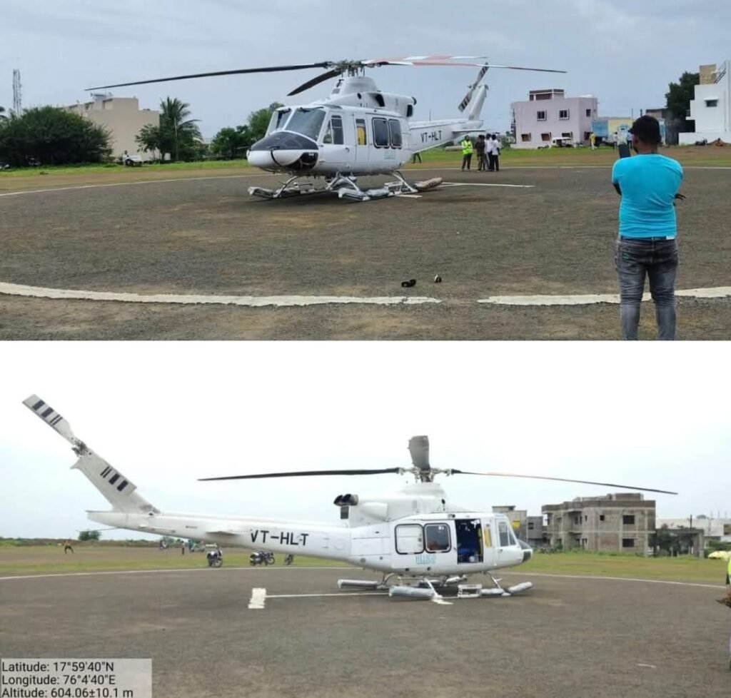 तुळजापूर :- हैदराबादहून पंढरपूरच्या दिशेने निघालेले मुंबईच्या हेलिगो चार्टर्ड कंपनीचे हेलिकॉप्टर बुधवारी दुपारी चुकून थेट तुळजापुरात उतरल्याने प्रशासनात एकच खळबळ उडाली. तुळजाभवानी मंदिरावर काही वेळ घिरट्या घालून ते थेट नळदुर्ग रोडवरील सार्वजनिक बांधकाम विभागाच्या हेलिपॅडवर उतरले.