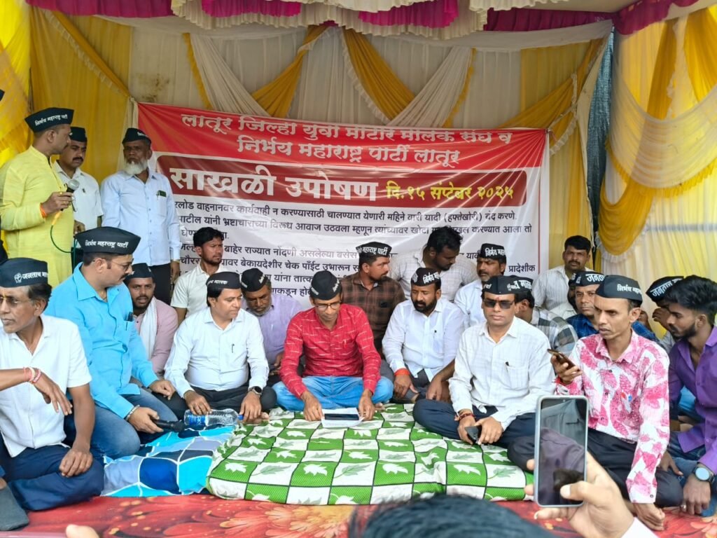 लातूर :प्रादेशिक परिवहन कार्यालयातील अधिकाऱ्यांचा कथित मनमानी कारभार, दलाली व भ्रष्टाचारामुळे सर्वसामान्य वाहतूकदारांची होत असलेली आर्थिक लूट थांबविण्यासाठी लातूर जिल्हा युवा मोटार मालक चालक संघ आणि निर्भय महाराष्ट्र पार्टी यांच्या वतीने कार्यालयासमोर सुरू असलेल्या बेमुदत साखळी उपोषण आंदोलनाचा आज दुसरा दिवस आहे.