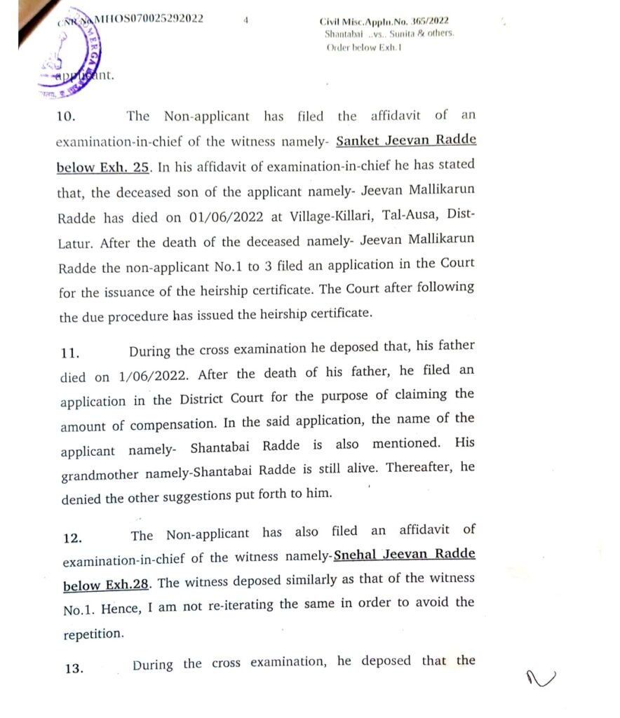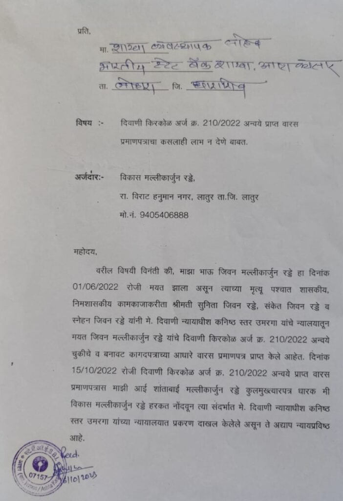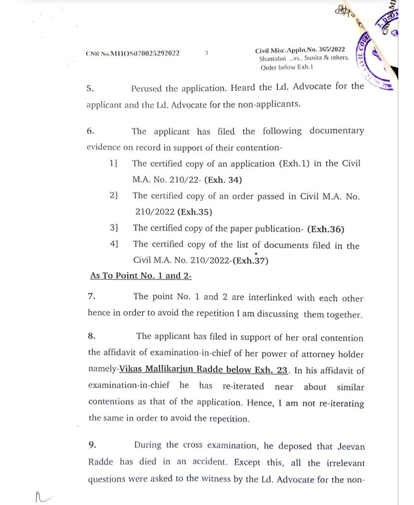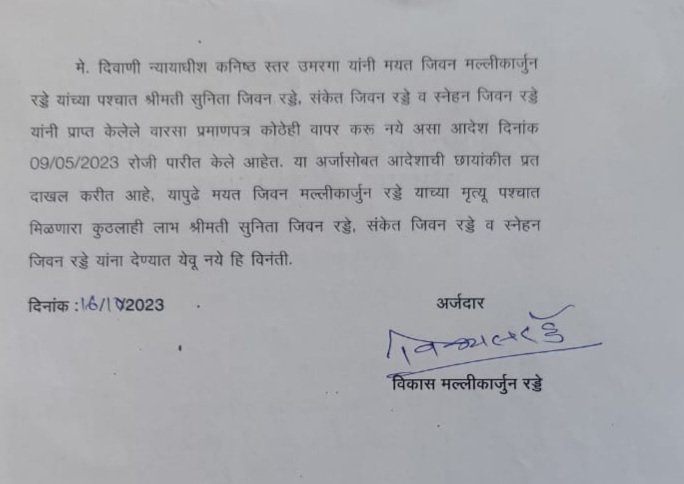 рдордпрдд рдЬрд┐рд╡рди рдорд▓реНрд▓рд┐рдХрд╛рд░реНрдЬреБрди рд░рдбреНрдбреЗ рдпрд╛рдВрдЪрд╛ рдореГрддреНрдпреВ рез рдЬреВрди реирежреиреи рд░реЛрдЬреА рдЭрд╛рд▓рд╛. рддреНрдпрд╛рдирдВрддрд░ рд╕реБрдиреАрддрд╛ рд░рдбреНрдбреЗ, рд╕рдВрдХреЗрдд рд░рдбреНрдбреЗ рдЖрдгрд┐ рд╕реНрдиреЗрд╣рди рд░рдбреНрдбреЗ рдпрд╛рдВрдиреА рджрд┐рд╡рд╛рдгреА рдХрд┐рд░рдХреЛрд│ рдЕрд░реНрдЬ рдХреНрд░. 210/2022 рджрд╛рдЦрд▓ рдХрд░реВрди рдЪреБрдХреАрдЪреНрдпрд╛ рдкрджреНрдзрддреАрдиреЗ рд╡рд╛рд░рд╕рд╛ рдкреНрд░рдорд╛рдгрдкрддреНрд░ рдорд┐рд│рд╡рд▓реЗ. рдорд╛рддреНрд░, рдордпрддрд╛рдЪреНрдпрд╛ рдЖрдИрдЪреНрдпрд╛ рд╡рддреАрдиреЗ рджрд┐рд░ рд╡рд┐рдХрд╛рд╕ рдорд▓реНрд▓рд┐рдХрд╛рд░реНрдЬреБрди рд░рдбреНрдбреЗ рдпрд╛рдВрдиреА рд╣рд░рдХрдд рдЕрд░реНрдЬ рджрд╛рдЦрд▓ рдХрд░реВрди рдмрдирд╛рд╡рдЯ рдХрд╛рдЧрджрдкрддреНрд░рд╛рдВрдЪрд╛ рдкрд░реНрджрд╛рдлрд╛рд╢ рдХреЗрд▓рд╛ рдЖрд╣реЗ.