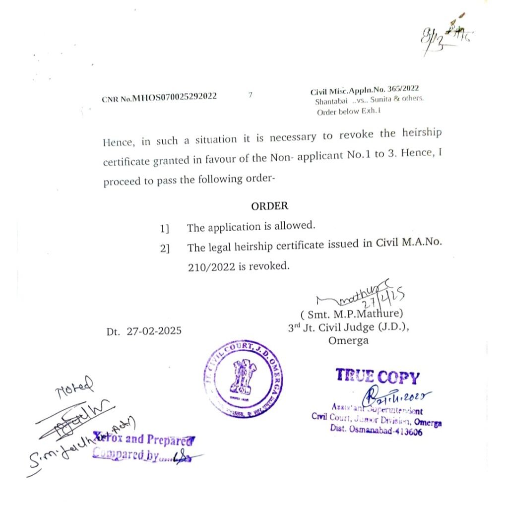 рджрд░рдореНрдпрд╛рди, рдпрд╛ рдлрд╕рд╡рдгреБрдХреАрдирдВрддрд░ рдордпрдд рдкрддреАрдЪреНрдпрд╛ рдХреБрдЯреБрдВрдмреАрдпрд╛рдВрдиреА рдереЗрдЯ рдХреЛрд░реНрдЯрд╛рдЪрд╛ рджрд░рд╡рд╛рдЬрд╛ рдареЛрдард╛рд╡рд▓рд╛. рд╕рдВрдмрдВрдзрд┐рдд рдЦрдЯрд▓рд╛ рдореЗ. рджрд┐рд╡рд╛рдгреА рдиреНрдпрд╛рдпрд╛рдзреАрд╢ рдХрдирд┐рд╖реНрда рд╕реНрддрд░, рдЙрдорд░рдЧрд╛ рдиреНрдпрд╛рдпрд╛рд▓рдпрд╛рдд рджрд╛рдЦрд▓ рдХрд░рдгреНрдпрд╛рдд рдЖрд▓рд╛ рдЕрд╕реВрди рдиреНрдпрд╛рдпрд╛рд▓рдпрд╛рдиреЗ рд╕реБрдирд┐рддрд╛ рд░рдбреНрдбреЗ рдпрд╛рдВрдЪреНрдпрд╛ рдмрд╛рдЬреВрдиреЗ рдорд┐рд│рд╛рд▓реЗрд▓реЗ рд╡рд╛рд░рд╕рд╛ рдкреНрд░рдорд╛рдгрдкрддреНрд░ рддрддреНрдХрд╛рд│ рд╡рд╛рдкрд░рд╛рд╕ рдордЬреНрдЬрд╛рд╡ рдХрд░рдгрд╛рд░рд╛ рдЖрджреЗрд╢ реп рдореЗ реирежреирей рд░реЛрдЬреА рджрд┐рд▓рд╛ рдЖрд╣реЗ.