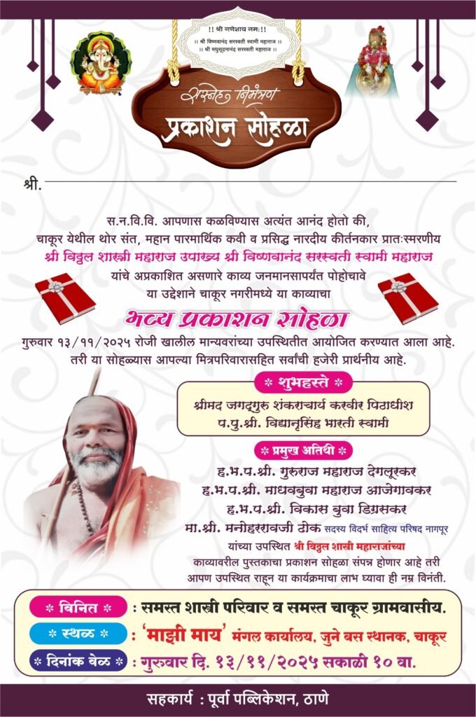 चाकूर दि.१(प्रतिनिधी)- येथील संत, पारमार्थिक कवी व नारदीय कीर्तनकार श्री विठ्ठल शास्त्री महाराज उपाख्य श्री विष्णवानंद सरस्वती स्वामी महाराज यांचे अप्रकाशित असणाऱ्या काव्याचे प्रकाशन १३ नोव्हेंबर रोजी करण्यात येत आहे.