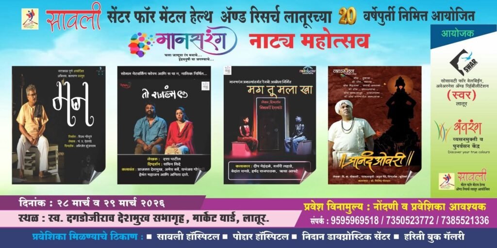 लातूर : लातुरात दि. २८ व २९ मार्च २०२६ रोजी मानसिक आरोग्याच्या विविध पैलूंवर भाष्य करणाऱ्या ‘ मानसरंग ‘ नाट्यमहोत्सवाचे आयोजन करण्यात आल्याची माहिती सावली सेंटर फॉर मेंटल हेल्थ अँड रिसर्च सेंटरचे संचालक – लातूरचे ख्यातनाम मानसोपचार तज्ञ डॉ. मिलिंद पोतदार यांनी दिली. या नाट्यमहोत्सवात दोन दिवसांमध्ये एकूण चार नाटके सादर होणार आहेत.