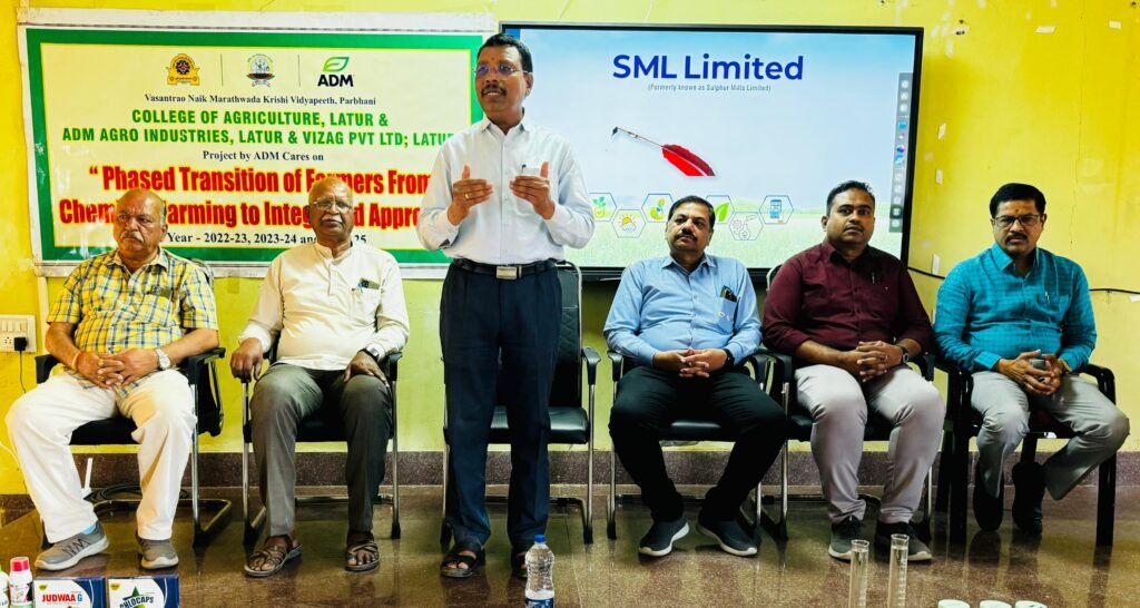 लातूर: कृषि महाविद्यालय, विलासराव देशमुख कृषि जैवतंत्रज्ञान महाविद्यालय, लातूर, एडिएम एग्रो इंडस्ट्रीज व एसएमएल यांच्या संयुक्त विद्यमाने “शाश्वत कृषि विकासासाठी रासायनिक शेतीचे टप्प्याटप्प्याने एकात्मिक शेतीकडे संक्रमण” या विषयावर प्रशिक्षकांना एक दिवसीय प्रशिक्षण कार्यक्रमाचे आयोजन करण्यात आले होते. यावेळी व्यासपीठावर कार्यक्रमाचे अध्यक्ष महाविद्यालयाचे अधिष्ठाता डॉ. बाबासाहेब ठोंबरे, प्रमुख मार्गदर्शक प्रा. अश्रोबा जाधव, तर प्रमुख पाहुणे डॉ. व्यंकट जगताप, डॉ.अच्युत भरोसे, अमोल ढवण व वशीष्ट घुले उपस्थित होते.